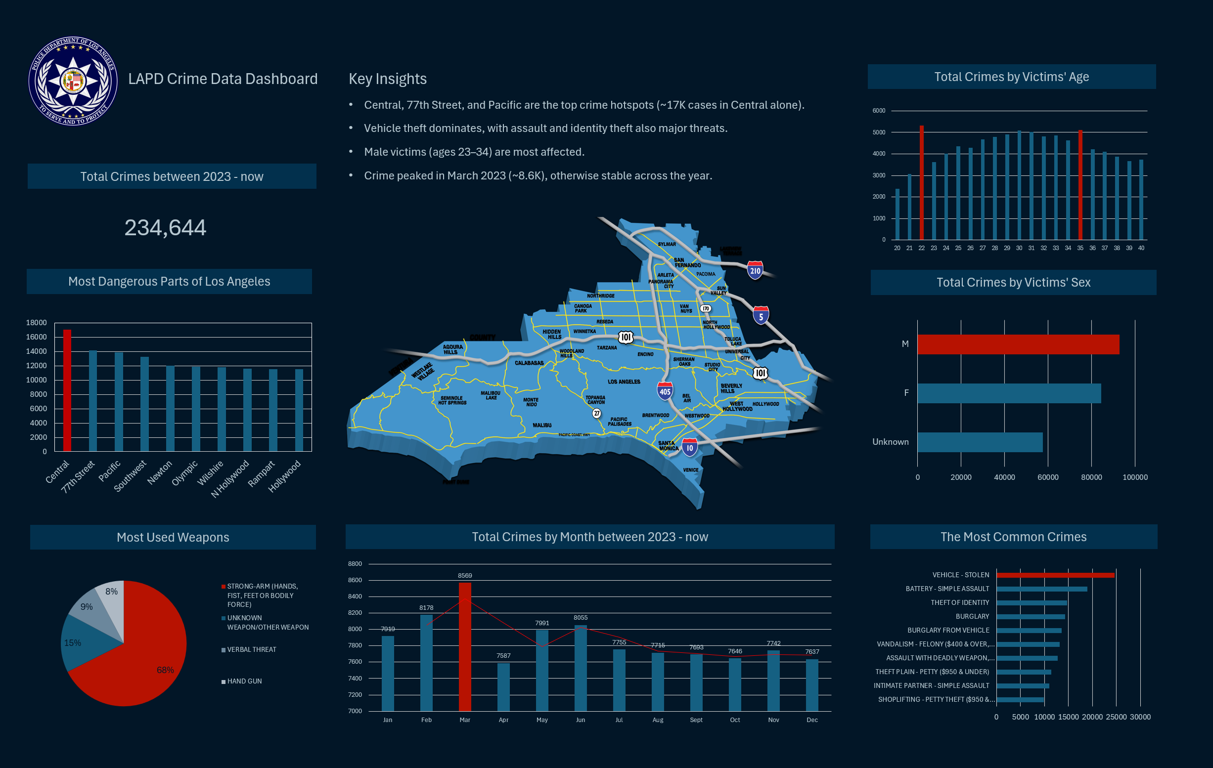 I cleaned and transformed 800K+ LAPD crime records in Power Query and Excel, handling missing values, inconsistent categories, and date/time formats. I built a dashboard that visualizes crime trends by area, victim demographics, crime types, and weapons used, providing clear insights into the most affected divisions and patterns over time.